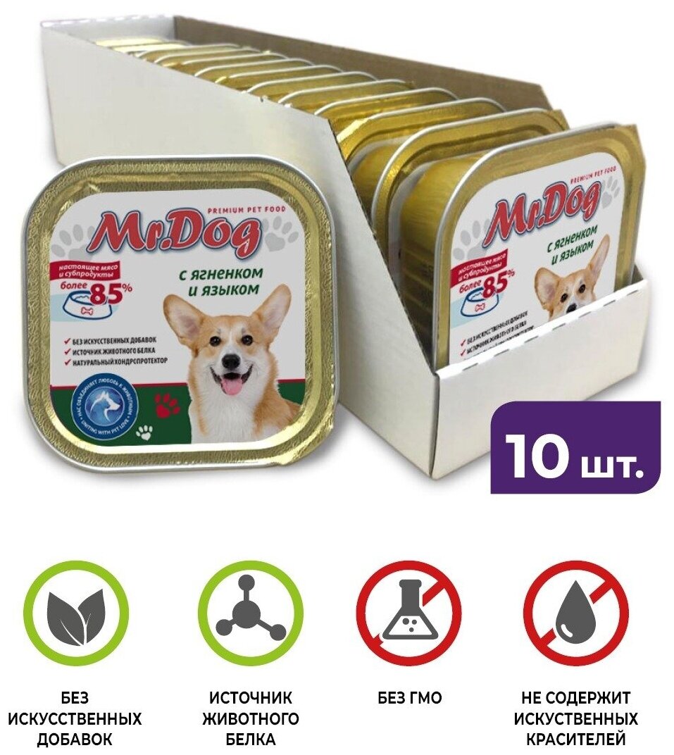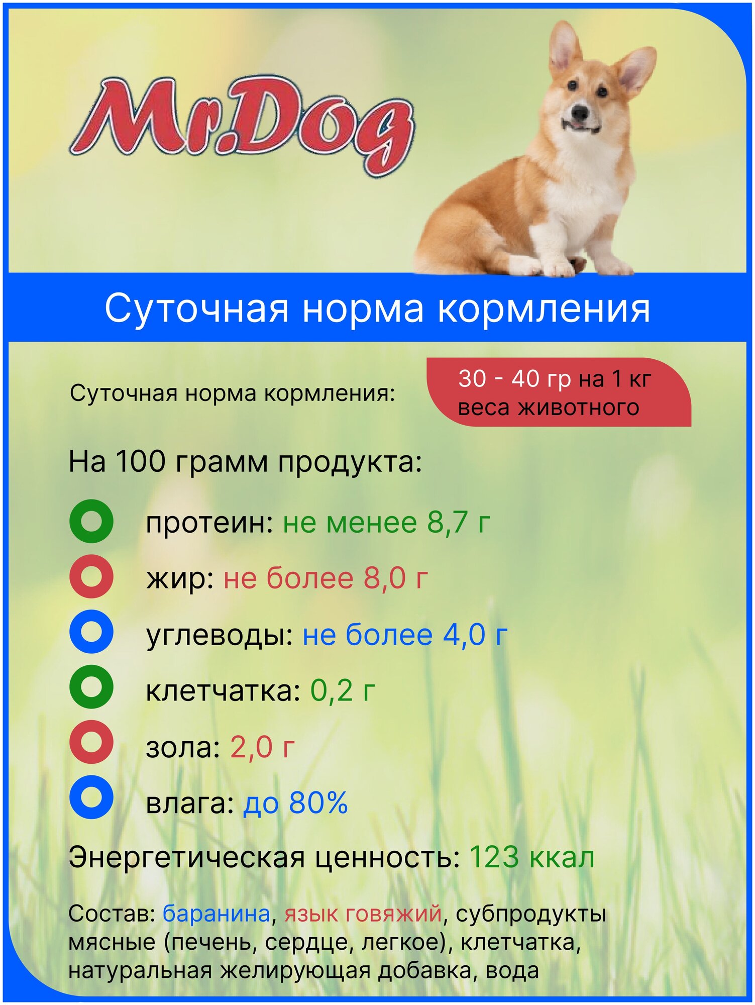 Лучшие цены. Консервированный влажный корм для собак Mr.Dog с с ягненком и языком - натуральный мясной продукт стандарта "Human grade", премиум класса, в составе которого только натуральные мясные ингредиенты. Продукт не содержит мясной муки, ГМО, сои, красителей, консервантов и искусственных ароматизаторов. Суточная норма кормления: 30 - 40 гр на 1 кг веса животного. Магазины в вашем городе.