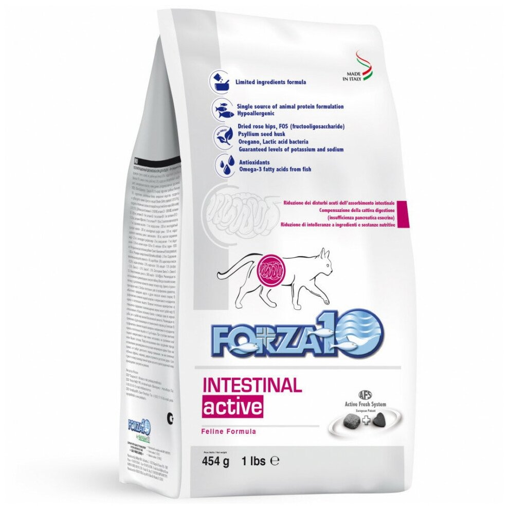 Лучшие цены. Forza10 Intestinal Active – это специализированная диета, разработанная научно-исследовательским отделом компании SANYpet, для кошек с расстройствами желудочно-кишечного тракта. Она подходит при всех случаях пищевой непереносимости, затрагивающей ЖКТ. Показания: диареи у кошек и её острые проявления хроническая недостаточность поджелудочной железы плохое пищеварение, нарушения кишечного всасывания сокращение непереносимости к ингредиентам и питательным веществам Особенности состава: Лактоферменты. Магазины в вашем городе.