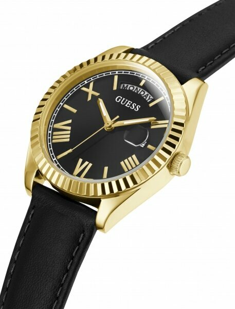 Лучшие цены. Женские кварцевые часы изготовлены из нержавеющей стали с IP покрытием цвета желтое золото. Классического стиля циферблат с узором солнечные лучи украшен чередующимися крупными римскими цифрами и рисками. Стрелки с люминесцентным покрытием, что повышает удобство считывания показаний в темноте. На отметки 3-часов расположено окно даты с увеличительным стеклом. Ретроградный счетчик дня недели расположен на отметки 12 часов. Кожаный ремень с контрастной прошивкой оснащен стандартной застежкой. Магазины в вашем городе.
