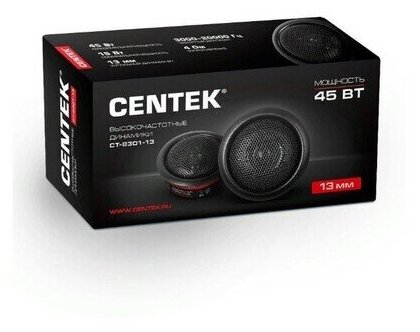 Лучшие цены. Твитер Centek СТ-8301-13 – набор из двух 13-миллиметровых высокочастотных динамиков круглой формы. Номинальная мощность источников звука высока: величина этого показателя составляет 15 Вт. Пиковая мощность втрое выше – 45 Вт. Динамики, оснащенные ферритовыми магнитами, способны обеспечить высокий уровень качества звука при любом уровне громкости, причем объем салона автомобиля может быть значительным. Модель может использоваться в минивене или крупном внедорожнике. Импеданс твитера Centek СТ-8301-13 – 4 Ом. Магазины в вашем городе.