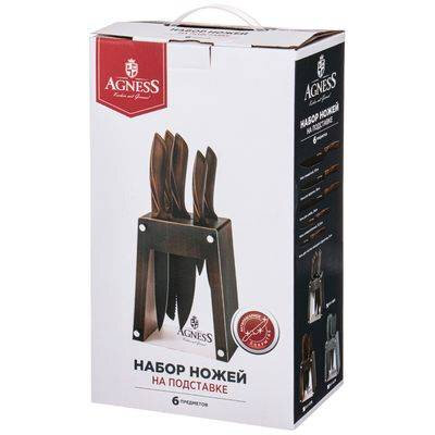 Лучшие цены. Набор ножей AGNESS "монблан" на пластиковой подставке, 6 предметов Нож - главный инструмент на кухне, а вернее ножи, т. к. даже самый лучший нож не сможет справиться со всем многообразием задач. Выбирая Набор ножей AGNESS - Вы приобретаете комплект самых необходимых и чаще всего используемых ножей. Преимущества ножей AGNESS: ● Эргономичная ручка с покрытием Soft Touch для удобной нарезки ● Лезвие из высокоуглеродистой коррозионной стали ● 2-х стороняя заточка лезвия ● Стильный дизайн ● Состав Набора. Магазины в вашем городе.