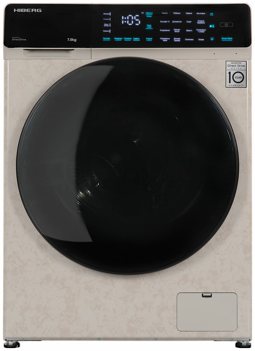 Стиральная машина HIBERG i-DDQ9 - 712 Ym, инверторная, 7 кг загрузка, 1200 об/мин, 16 программ, Smart wash, таймер, прямой привод, бежевый мрамор
