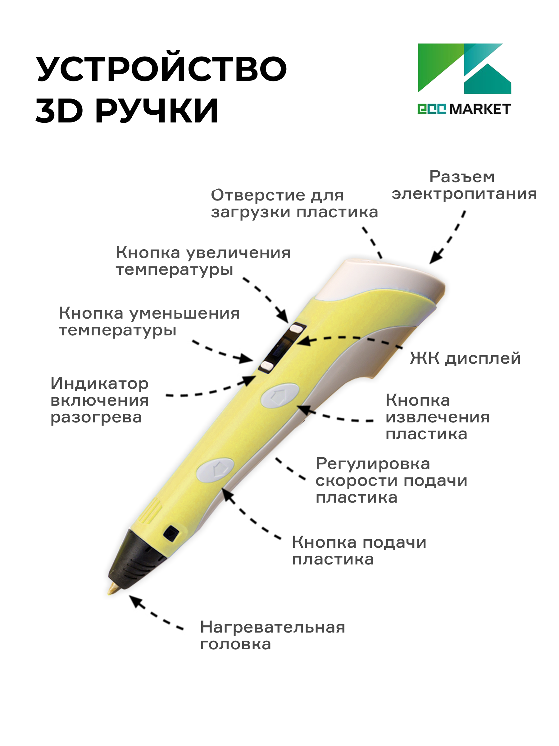 3D ручка ECC Market 3D Pen 2 с набором дополнительного пластика "радуга" и трафаретами желтый