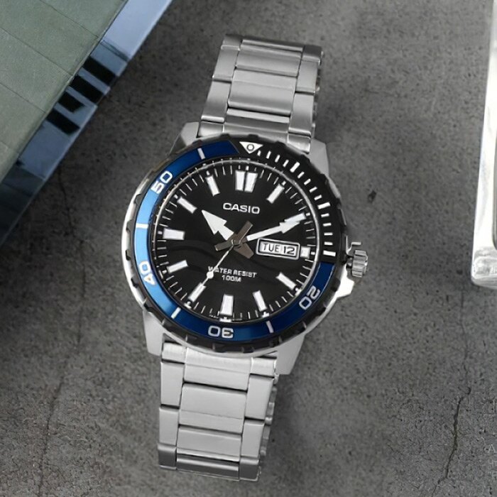 Лучшие цены. Часы Casio Collection MTD-125D-1A2 созданы для мужчин, которые не представляют свою жизнь без спорта. Циферблат представлен с метками в виде штрихов. Окошко даты и дня недели находится в положении 3 часа. Пластиковый бейзель вращается в одном направлении. Браслет выполнен из нержавеющей стали со складной застежкой, которая сводит к минимуму вероятность потери часов. Водонепроницаемость часов позволяет плавать с маской и трубкой, так как составляет 10 Бар. Срок службы 1-го аккумулятора - 3 года. Магазины в вашем городе.