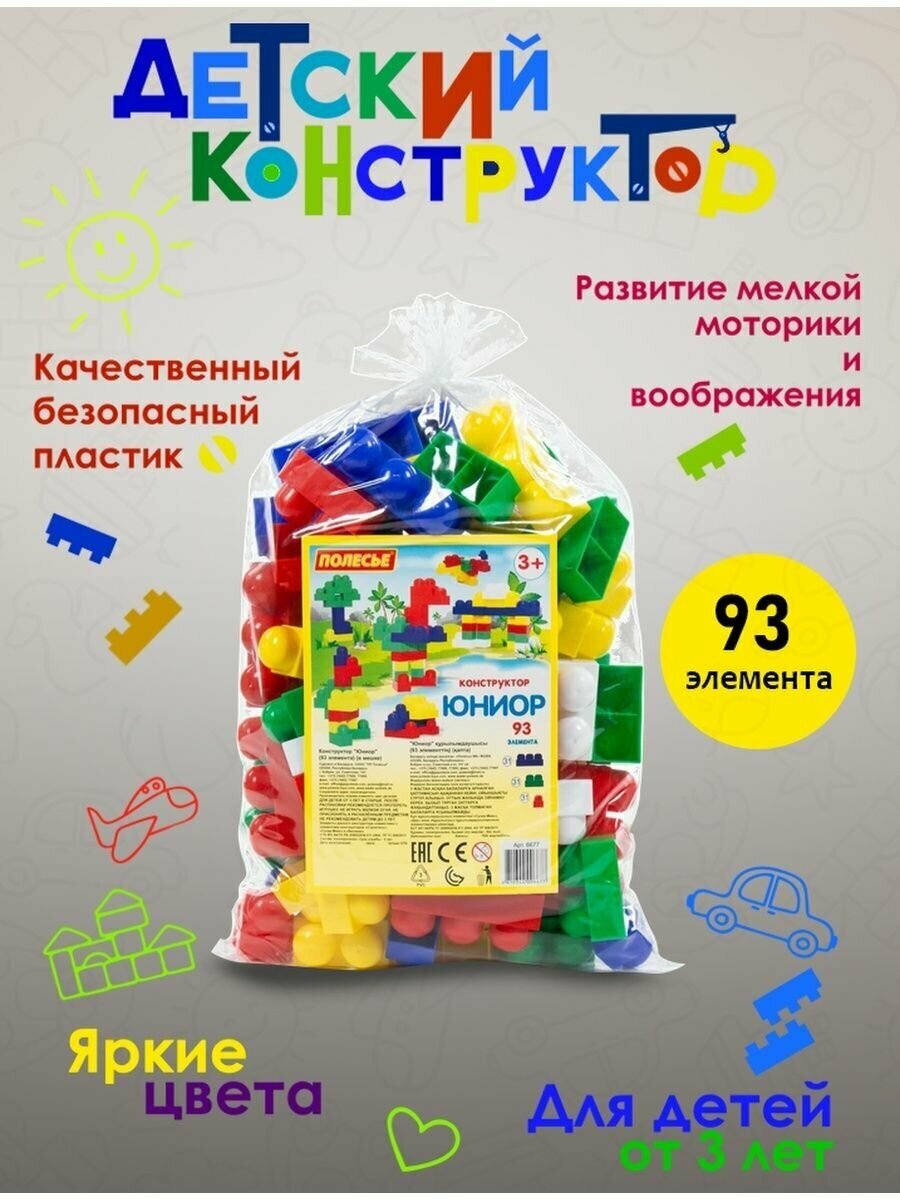 Лучшие цены. В набор конструктор "Юниор" (93 элемента) (в мешке) входит девяносто три детали различных размеров (одинарные, двойные, тройные) с крупными соединительными элементами округлой формы, что позволяет играть в данный конструктор малышам любого возраста и составлять масштабные постройки. Во время игры малыш развивает воображение и двигательные навыки, анализирует формы, размеры и расцветку предметов, учится соединять предметы между собой в самостоятельно заданном порядке, создает новые объекты для. Магазины в вашем городе.