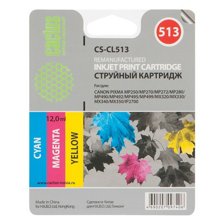 Картридж Cactus CS-CL513, совместимый, цветной, для Canon PIXMA-iP2700 / iP2702 / MP230 / MP240 / MP250 / MP252 / MP260 / MP270 / MP272 / MP280 / MP282 / MP480 / MP490 / MP492 / MP495 / MP499 / MX320 / MX330 / MX340 / MX350 / MX360 / MX410 / MX420