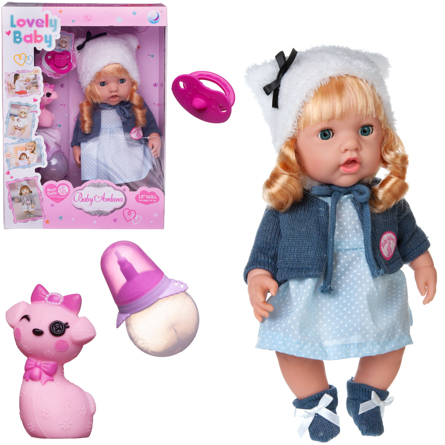 Лучшие цены. Эта очаровательная куколка-пупс выглядит как настоящий малыш. Она умеет пить воду и писать. У нее есть соска, бутылочка, любимая игрушка "Кошечка". Куколка-блондинка одета в светлое платье и темно-серую кофточку, шапочку, носочки. Кукла упакована в подарочную красивую коробку. Особенности: бутылочка, соска, мини-игрушка в комплекте. функции: пьет-писает. особенности: тело твердое, голова вращается, глазки закрываются. одежда снимается. Магазины в вашем городе.