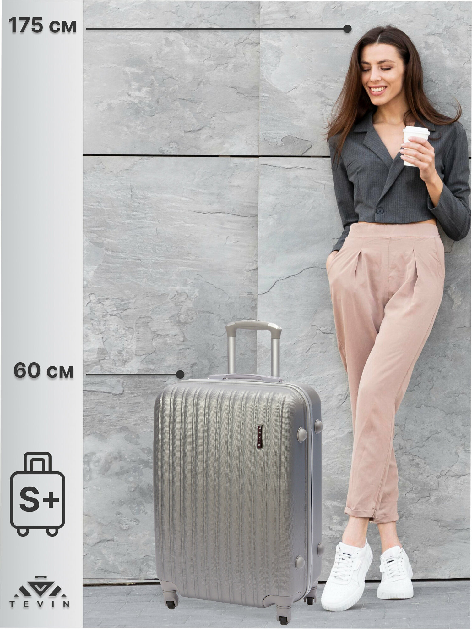 Чемоданы Чемодан на колесах дорожный средний багаж для путешествий небольшой s+ TEVIN размер С+ 60 см 52 л легкий и прочный abs (абс) пластик Серебряный