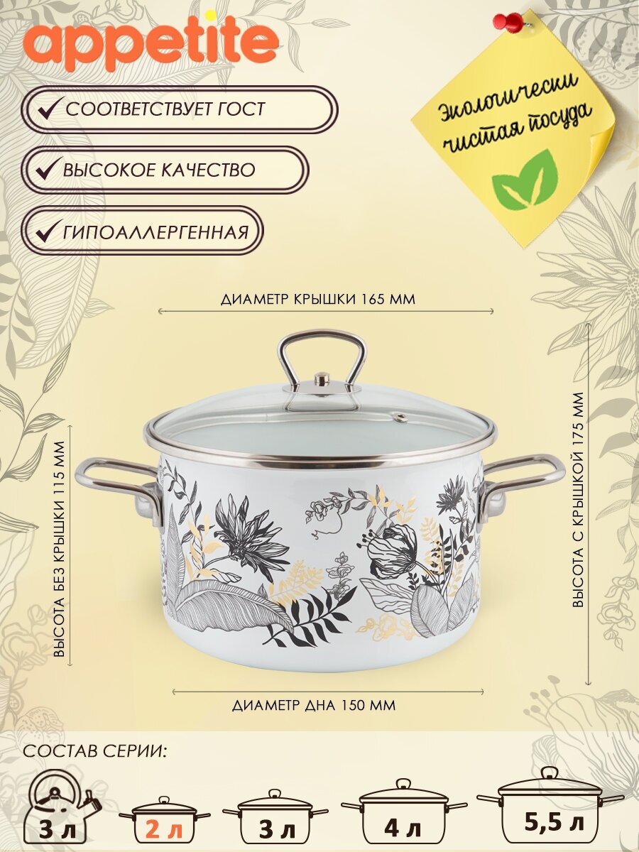 Лучшие цены. Эмалированная кастрюля емкостью 2 литра ТМ Appetite серии Botany. Посуда очень экологична, не вступает в реакцию с пищевыми кислотами и щелочами, тем самым сохраняется вкус пищи, в нее не попадают вредные для здоровья человека соединения. В кастрюле можно не только готовить, но и безопасно хранить пищу. Кастрюля также подходит для заготовок и маринования, для шашлыков, для супов, для квашения - это универсальная посуда на кухне. Магазины в вашем городе.