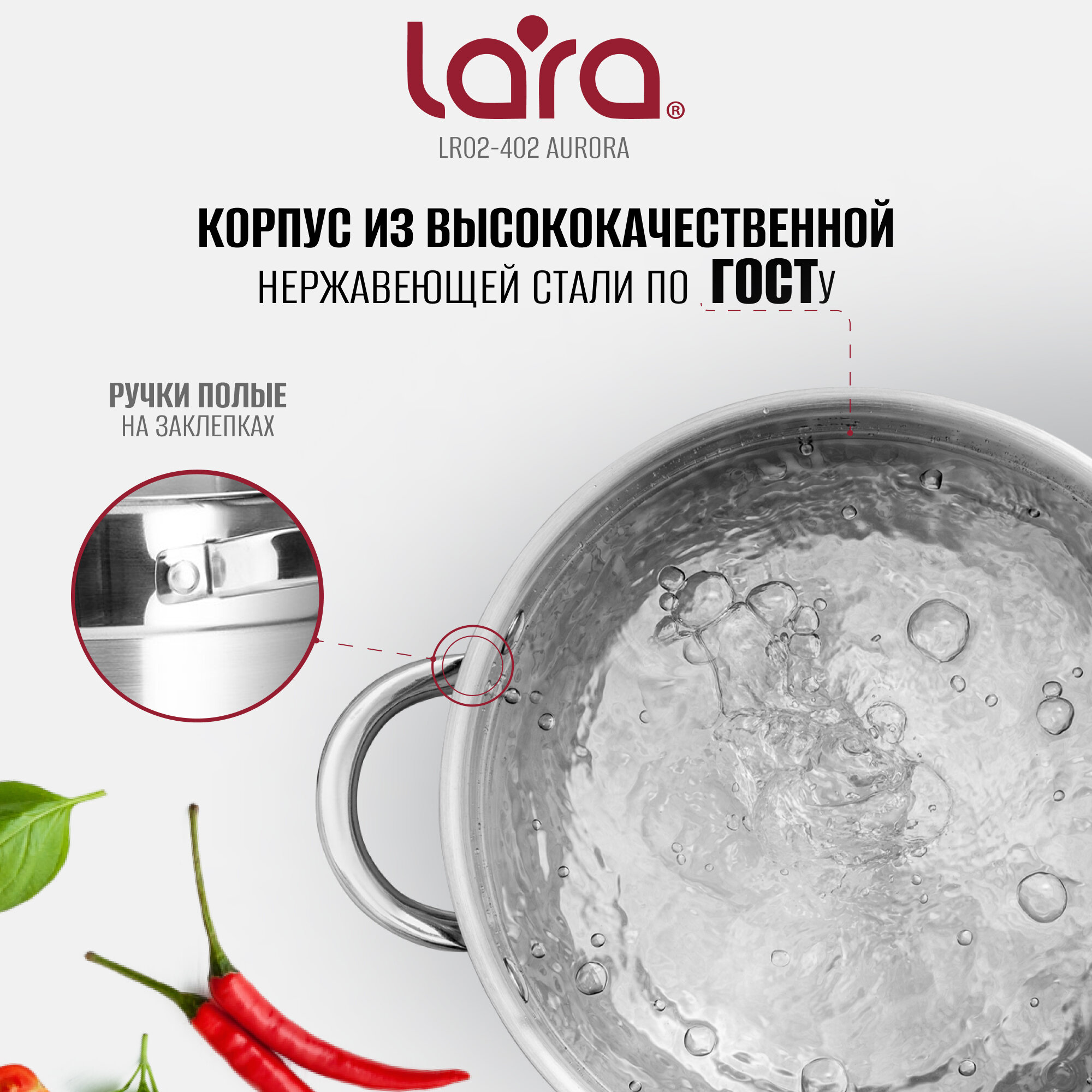 Lara LR02-403 Кастрюля (нерж) серия AURORA 13,0x22см, 4.8л, стал.ручки, капсулир индукц дно, крышка