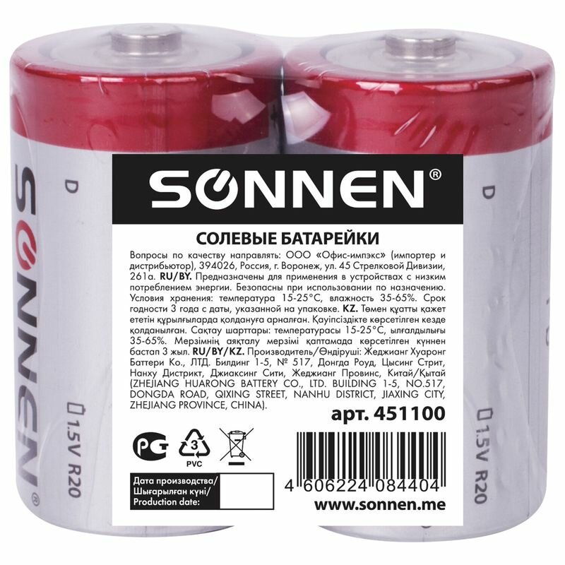 Квант продажи 1 ед. Батарейки комплект 2 шт, SONNEN, D (R20), солевые, в пленке, 451100