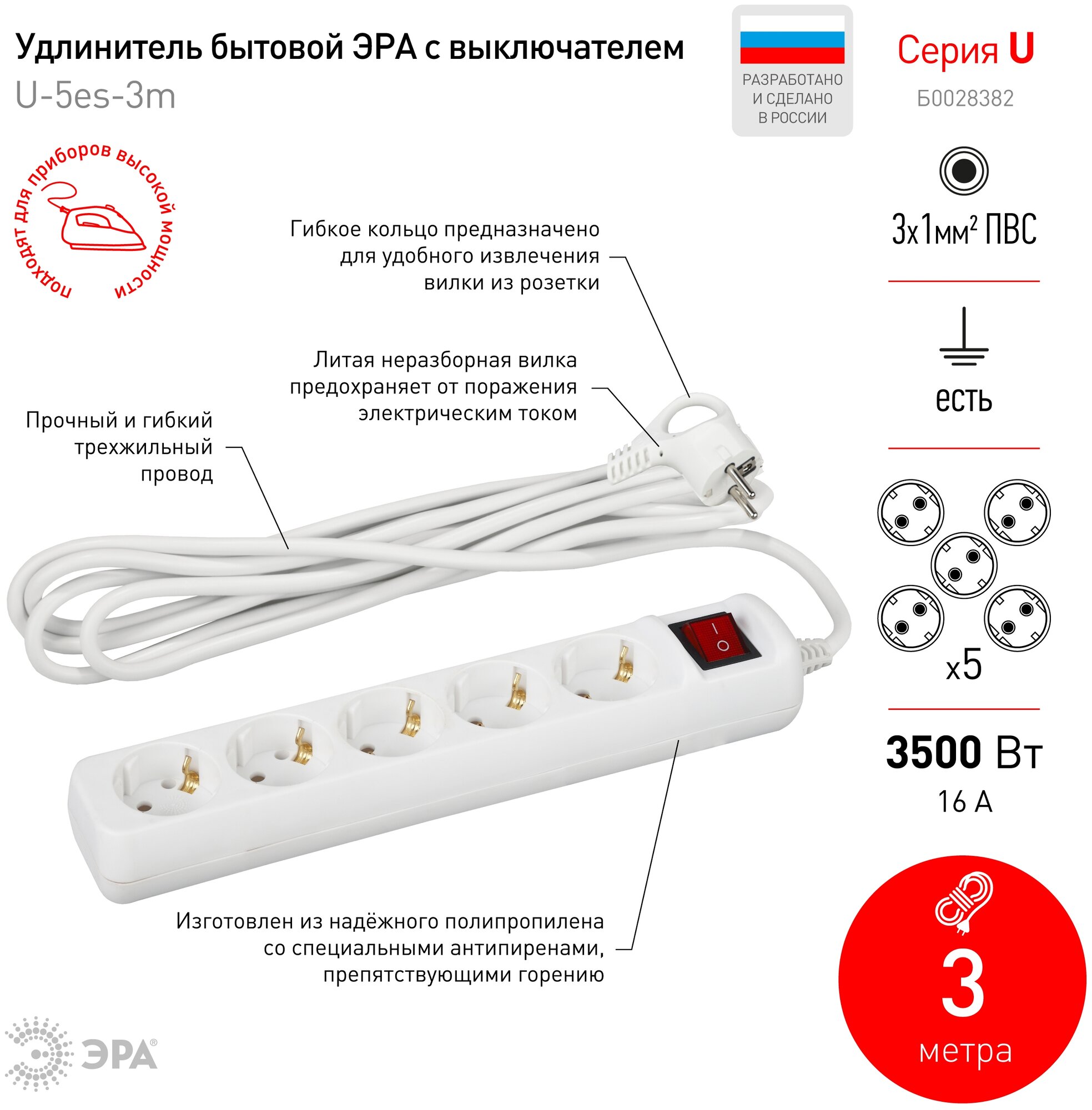 Лучшие цены. Удлинитель ЭРА U-5es-3m Россия с заземлением, 3x1мм2, 16A, ПВС, с выкл, 5гн, 3м Б0028382 станет Вашим надежным помощником, если Ваши любимые электроприборы находятся далеко от розеток. Провод в удлинителях Эра сделан из 100% меди, что делает его абсолютно пожаробезопасным. Корпус выполнен из ударопрочного и негорючего пластика (полипропилен). У вилки есть кольцо для удобного извлечения из розетки. Модель удлинителя на 16А позволяет подключить мощные бытовые приборы общей нагрузкой до 3500Вт. Магазины в вашем городе.