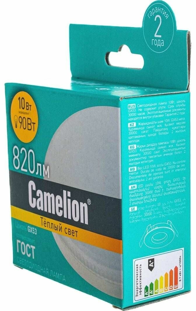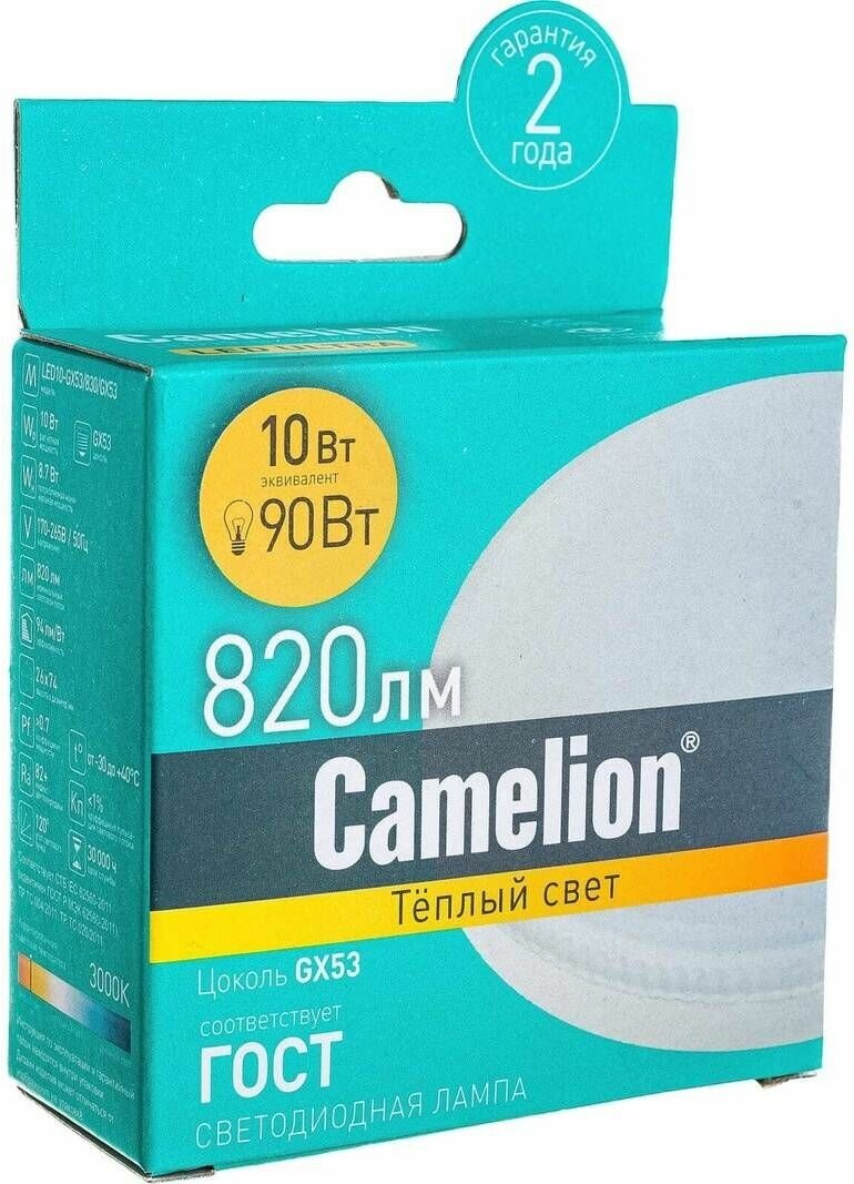 Лампа светодиодная GX53, 10 Вт, 90 Вт, таблетка, 3000 К, свет теплый белый, Camelion