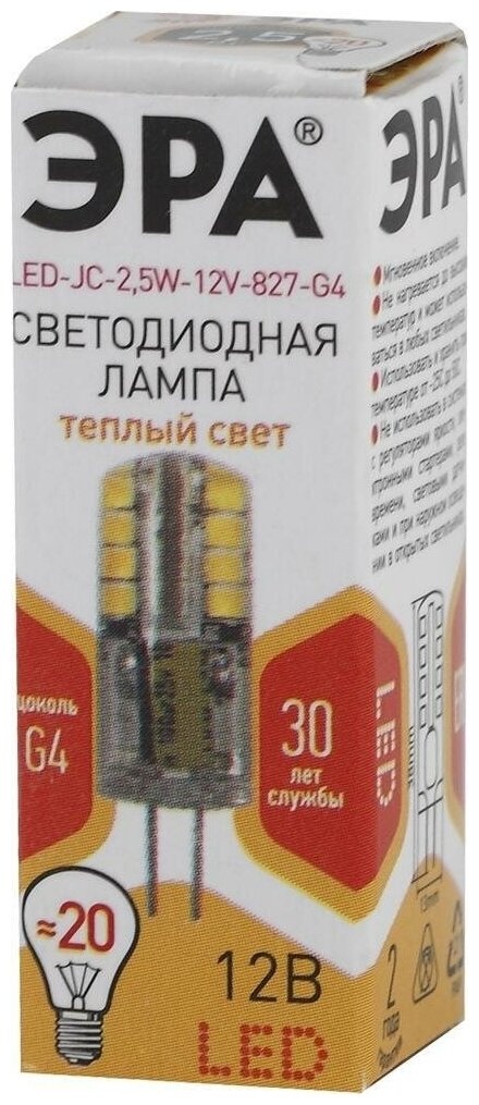 Светодиодная лампа ЭРА JC 12V 2.5W эквивалент 20W 2700K 200Лм G4 капсула