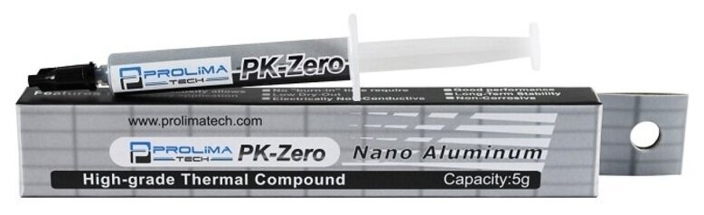 Лучшие цены. "PK-Zero алюминиевая термопаста - 5г" PK-Zero Prolimatech немного дешевле, по сравнению с чрезвычайно популярной и отмеченной наградами в тестах, серии термопаст PK-Nano. В зависимости от использования, этих 5 грамм достаточно для многих нанесений. PK-Zero является отличным выбором, когда дело доходит до оптимального отвода тепла от CPU или GPU к радиатору. Магазины в вашем городе.