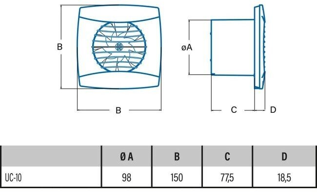 Лучшие цены. Характеристики: Тип вентилятора Накладной Тип установки Настенный, Потолочный Бренд CATA (Испания) Модель UC-10 HYGRO Гарантия 24 месяца Цвет Белый Основные характеристики Диаметр воздуховода, мм 100 Производительность, м3/ч 110 Энергопотребление, Вт 8 Уровень шума, дБ 26 Степень защиты, IP IP44 (Защита от попадания капель, брызг и пыли независимо от направления) Режим работы и функции Скорость вращения вентилятора, об./мин. 2200 Количество скоростных режимов, шт. Магазины в вашем городе.