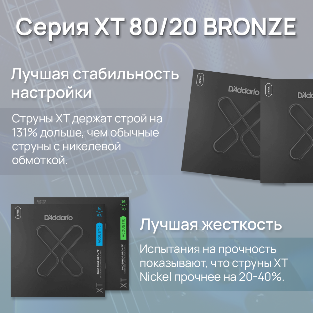 XTABR1253 XT Комплект струн для акустической гитары, бронза 80/20, 12-53, с покрытием, D'Addario
