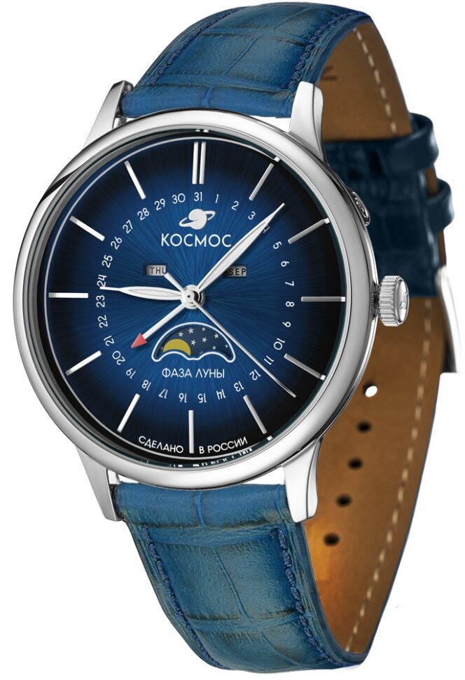 Лучшие цены. В часах Космос с кварцевым механизмом сочетаются надежность и многофункциональность. Корпус сделан из нержавеющей стали, что означает гипоаллергенность и высокую износостойкость. Его круглая форма с мягкими линиями универсальна - вы легко впишете часы в любой образ. Дополнительные индикаторы фаз луны, дня недели и месяца размещены на хорошо читаемом циферблате синего цвета с интересным эффектом градиента. Магазины в вашем городе.