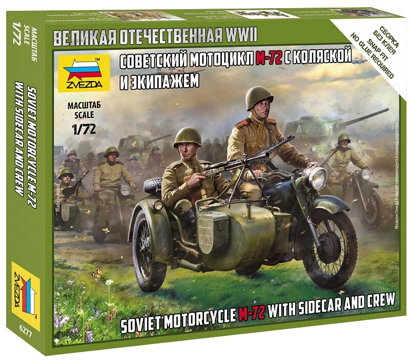Лучшие цены. Сборные солдатики ZVEZDA Советский мотоцикл М-72 с коляской и экипажем, 1/72 Мотоцикл М-72 был разработан в СССР путём адаптации к отечественному производству немецкого BMW R71 в 1941 году. Массовое производство было развёрнуто на Московском мотоциклетном заводе (ММЗ), а также в Ленинграде на заводе «Красный Октябрь», а с февраля 1942 года в Ирбите. Мотоцикл предназначался исключительно для армии, поэтому на него устанавливались сумки для боеприпасов, устройства для закрепления ручного пулемёта Дегтярёва ДП. Магазины в вашем городе.