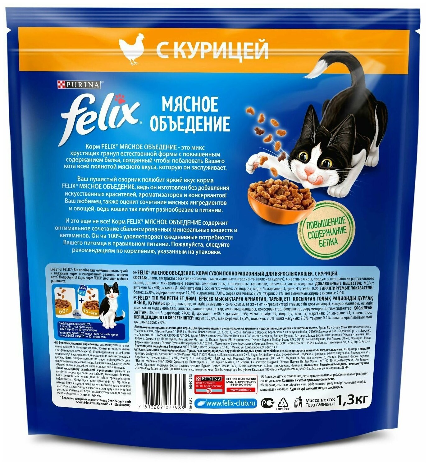Сухой корм Felix "Мясное объедение" для кошек, курица, 1.3 кг