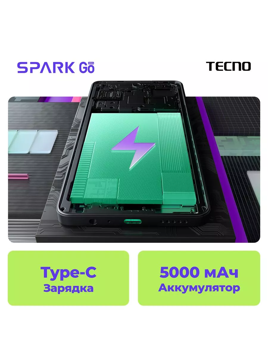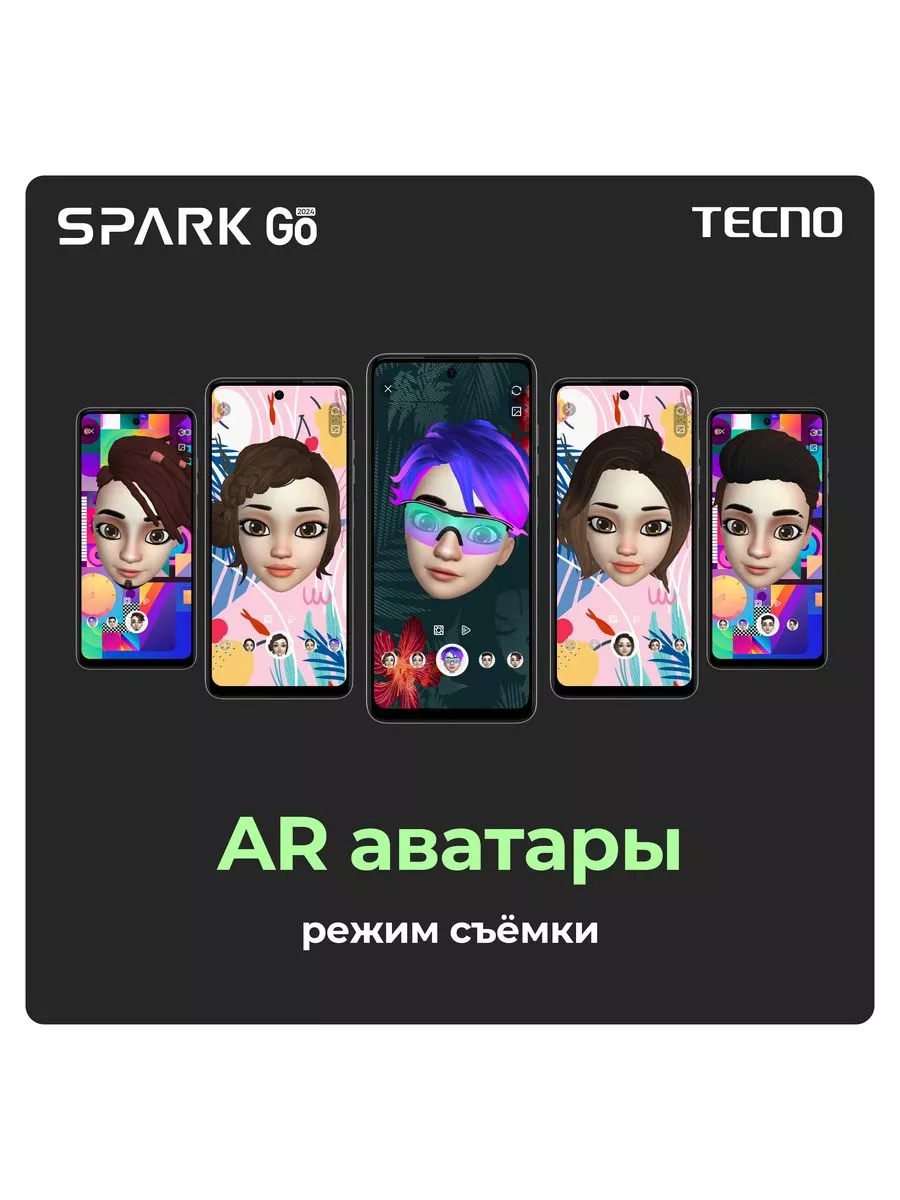 Лучшие цены. Смартфон Tecno Spark Go 2024 (NFC) Две текстуры. Один дизайн Яркий дизайн и ничего лишнего Встречайте обновленный дизайн с узнаваемым трехкольцевым блоком камер. Корпус выполнен в двух вариантах: яркая переливающаяся разными цветами текстура, а также экокожа Magic Skin 2.0 в свежем оттенке из безвредного экологичного материала. Выбери свой стиль! Удивительное путешествие в мир контента Экран 6.6" с частотой обновления 90 Гц Погрузись в яркий мир контента на большом экране 6.6”. Магазины в вашем городе.