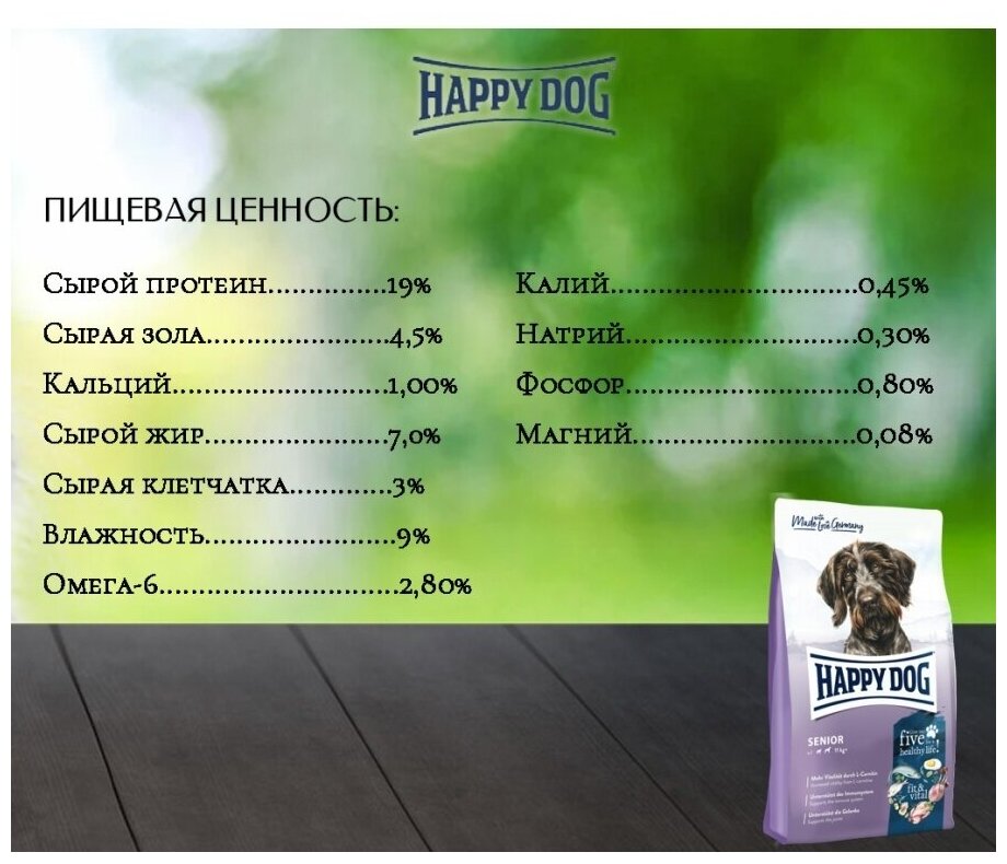Лучшие цены. Happy Dog Supreme - Senior Полнорационный корм для всех пожилых собак весом от 11 кг.Жизненная сила во второй половине жизни. С возрастом обменвеществ у наших питомцев постепенно перестраивается. Дляподдержания работы внутренних органов подходящий корм для пожилых собак должен содержать меньше белка, натрия и фосфора.Однако снижение калорийности не должно быть значительным.Happy Dog Senior содержит пять легко усваиваемых источников белканаилучшего качества и потому является особенно сбалансированнымкормом. Магазины в вашем городе.