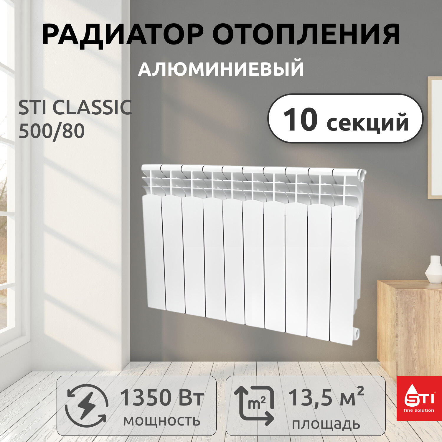 Радиатор секционный STI Classic/AL 500, кол-во секций: 10, 13.5 м2, 1350 Вт, 800 мм.алюминиевый
