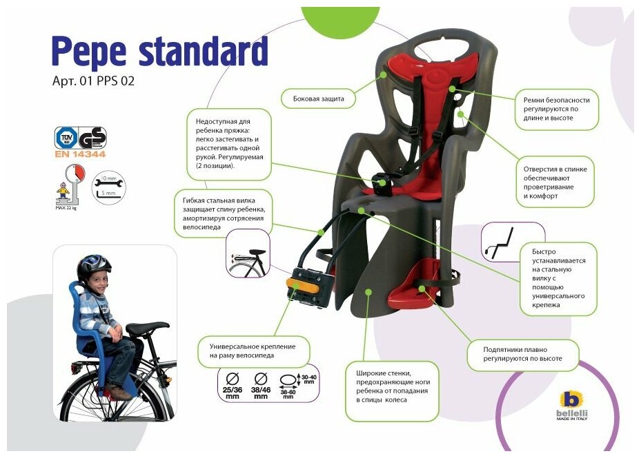 Детское велокресло BELLELLI PEPE, на подседельную трубу, до 22кг