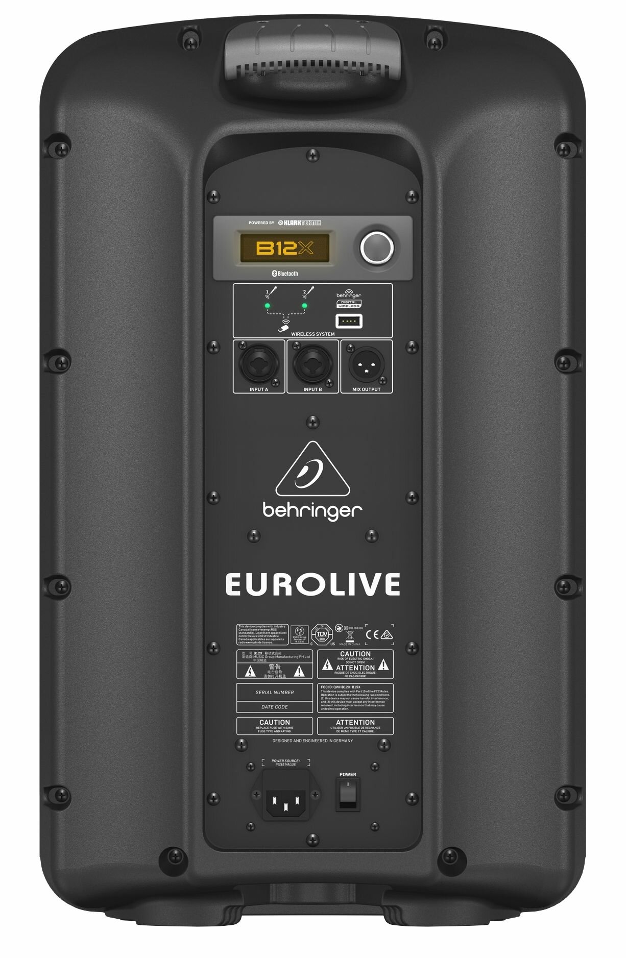Behringer B12X активная акустическая система, 12"+1"фенольный, 1000Вт (700Вт+300Вт) пик. Klark Teknik, Bluetooth, вход Behringer Wireless, пластик, 14.5кг, чёрный