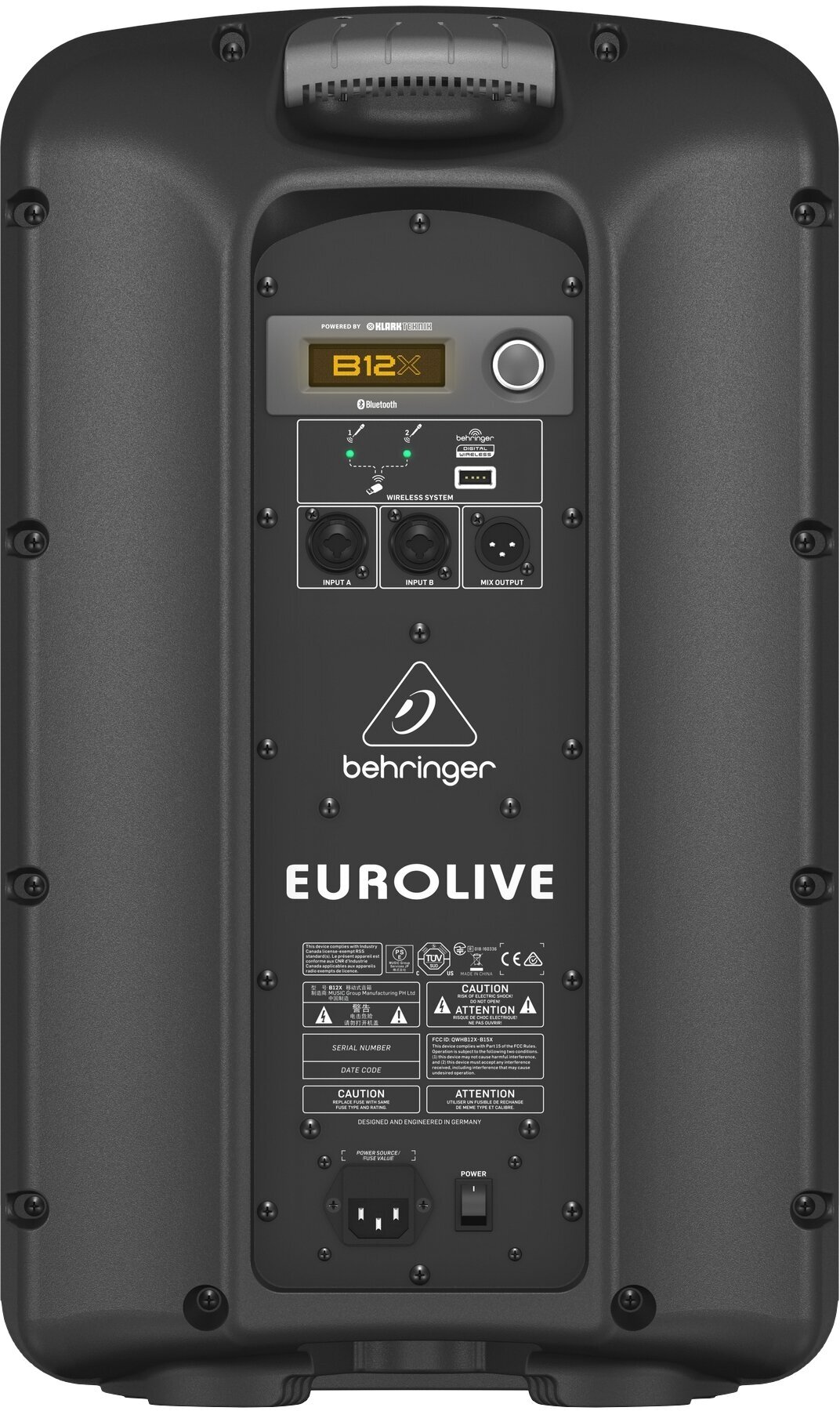 Акустическая система Behringer B12X активная акустическая система, 12"+1"фенольный, 1000Вт (700Вт+300Вт) пик. Klark Teknik, Bluetooth, вход Behringer Wireless, пластик, 14.5кг, чёрный