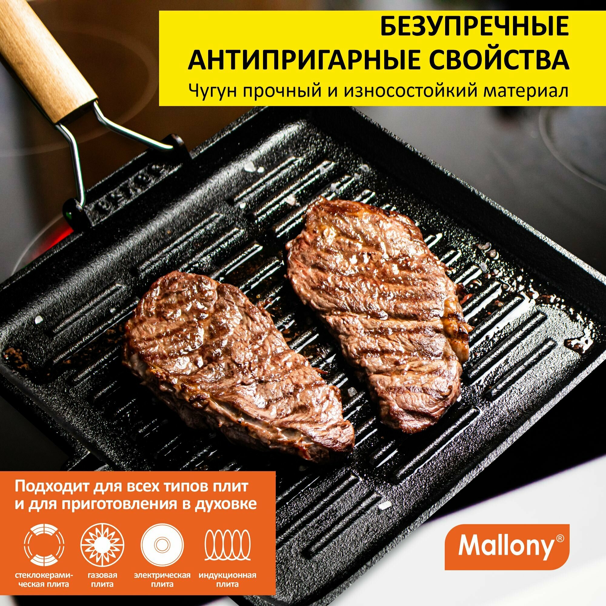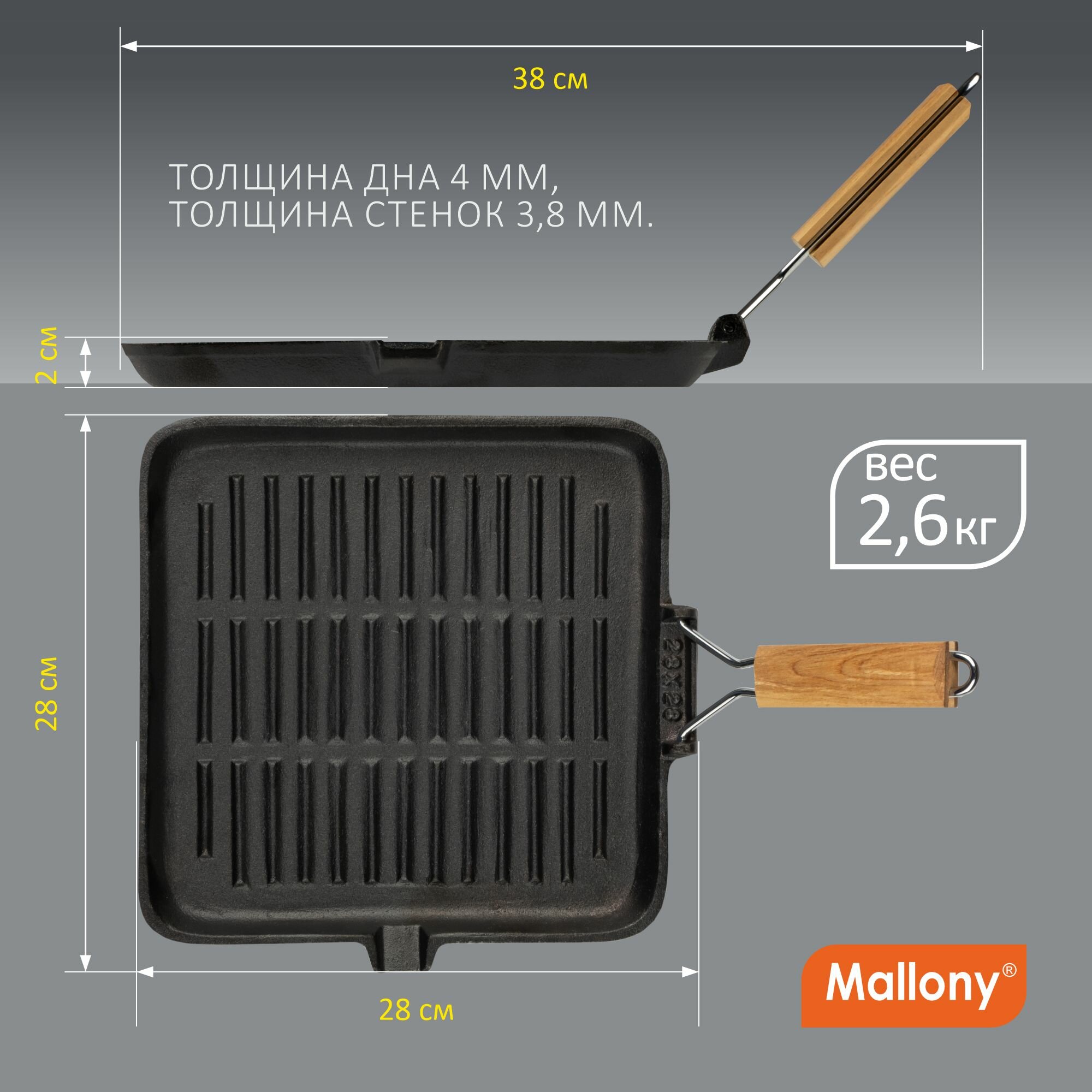 Сковорода-гриль Mallony , чугунная, с деревянной складной ручкой, 28X28 см