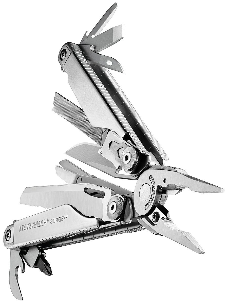 Лучшие цены. Leatherman Surge — один из двух самых больших мультитулов Leatherman. Рабочая лошадка с мощными плоскогубцами, большим ножом и фиксаторами всех инструментов. Уникальная особенность Surge — адаптер для инструментов, который позволяет устанавливать полотна от лобзиков Bosh. Leatherman Surge создан для тяжелой работы и рук, готовых её выполнять. 21 инструмент Leatherman Surge: 1. Острогубцы 2. Плоскогубцы 3. Заменяемые кусачки 4. Заменяемые кусачки для каленой проволоки 5. Кусачки для многожильного троса 6. Магазины в вашем городе.