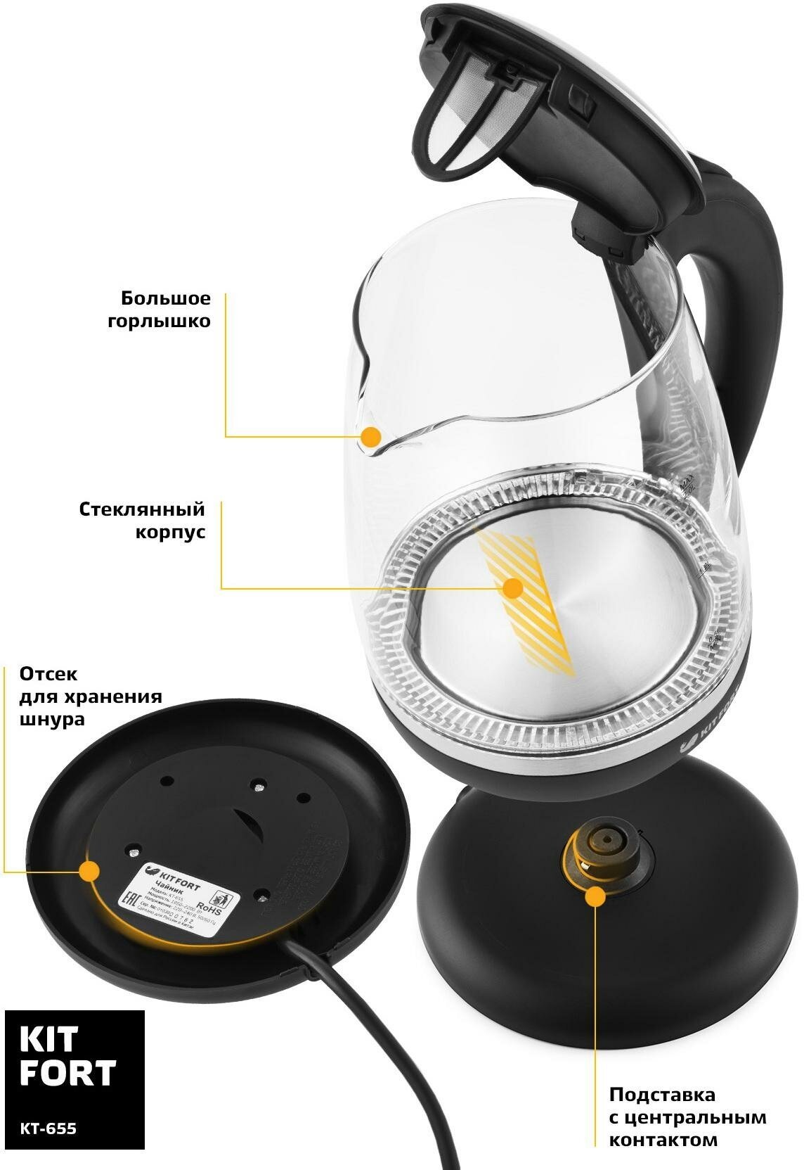 Чайник электрический Kitfort KT-655, стекло, 1.5 л, 2200 Вт, чёрно-серебристый