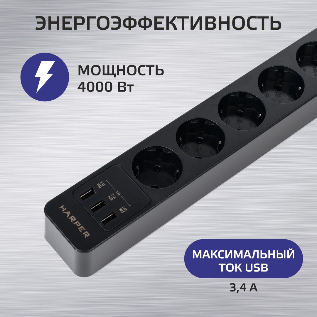 Сетевой фильтр HARPER UCH-530, 5 розеток, 1.5 м, с/з, 16А / 4000 Вт черный