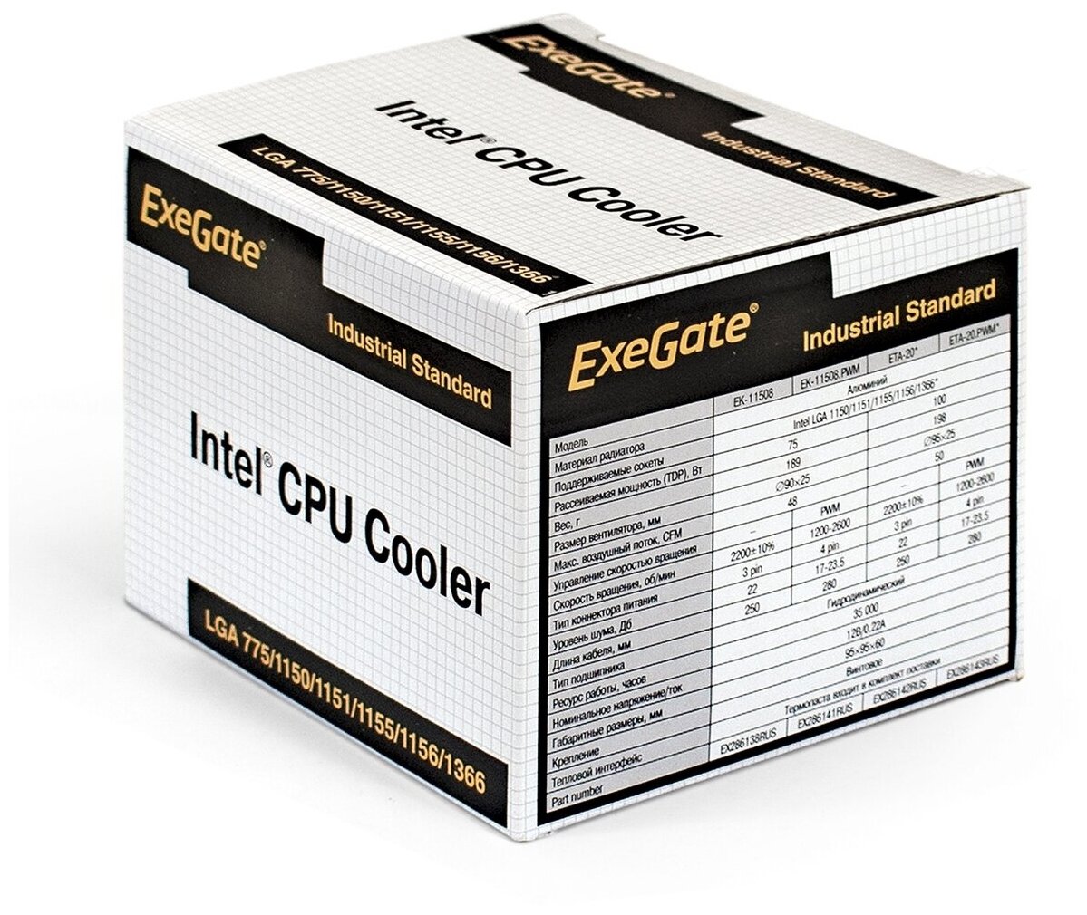Лучшие цены. [Вентиляторы] Exegate EX286138RUS Кулер ExeGate EK-11508 (Al, LGA1150/1151/1155/1156/1200, TDP 75W, Fan 90mm, 2200RPM, Hydro bearing, 3pin, 22db, 285г, с термопастой, на винтах, Retail color box) Exegate EX286138RUS Кулер ExeGate EK-11508 (Al, LGA1150/1151/1155/1156/1200, TDP 75W, Fan 90mm, 2200RPM, Hydro bearing, 3pin, 22db, 285г, с термопастой, на винтах, Retail color box) масса(кг). Магазины в вашем городе.