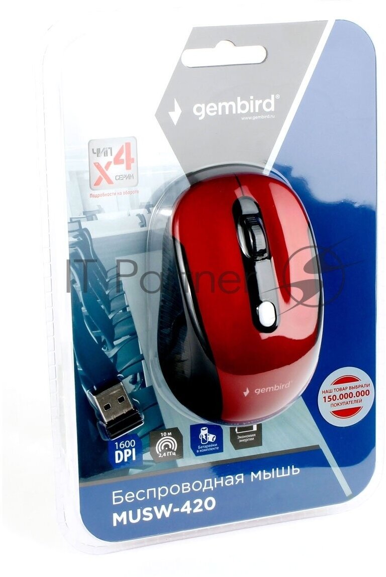 Мышь беспров. Gembird Musw-420-1, 2.4ГГц, красный,4кн, 1600DPI, блистер Gembird MUSW-420-1
