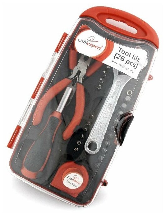 Лучшие цены. Набор инструментов Cablexpert TK-BASIC-03 - это универсальный набор, состоящий из 26 предметов, и включающий самое необходимое - плоскогубцы, кусачки, универсальный ключ, рулетка и сменные биты. Набор содержит наиболее популярные биты: Torx, Hex, Phillips и др. Набор инструментов упакован в удобный пластиковый кейс. Вы можете купить универсальный набор инструментов Cablexpert TK-BASIC-03 в нашем интернет магазине по очень низкой цене. Магазины в вашем городе.