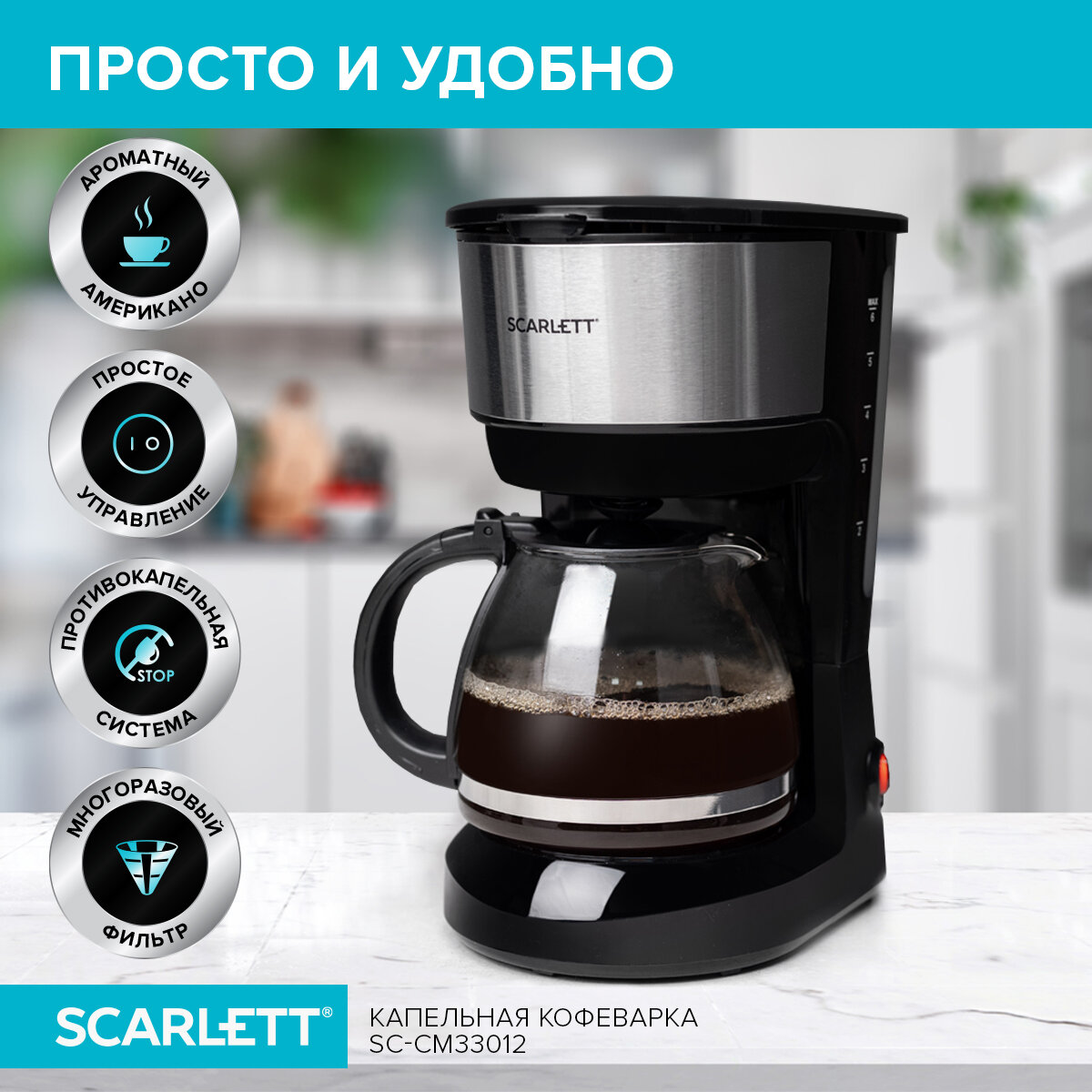 Лучшие цены. Кофеварка капельного типа Scarlett SC-CM33012 – простое в использовании устройство, которое каждый день будет радовать вас бодрящим ароматным напитком. Объём стеклянной колбы – 0,75 мл, что позволит приготовить сразу несколько чашек. Не все члены семьи завтракают одновременно? Плита автоподогрева сохранит кофе горячим. удобно И практично Вам не понадобится приобретать расходники, так как эта модель оснащена съёмным многоразовым фильтром. Магазины в вашем городе.