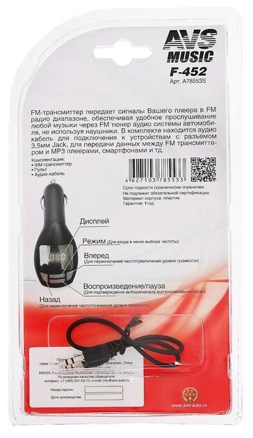 FM-трансмиттер Mp3 Плеер + Fm Трансмиттер С Дисплеем И Пультом Avs F-452 AVS арт. A78553S