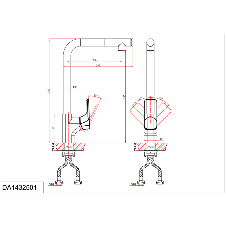 Смеситель для кухни 38,5к D&K DA1432501 высокий пов. излив, п/гайку, с выдвижной лейкой хром