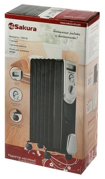 Лучшие цены. Масляный радиатор от производителя Sakura- это залог тепла и уюта в каждом доме. Благодаря высокой мощности рассматриваемая модель обеспечит быстрый нагрев помещения, а достаточно длинный шнур питания сделает использование прибора максимально комфорт. Магазины в вашем городе.