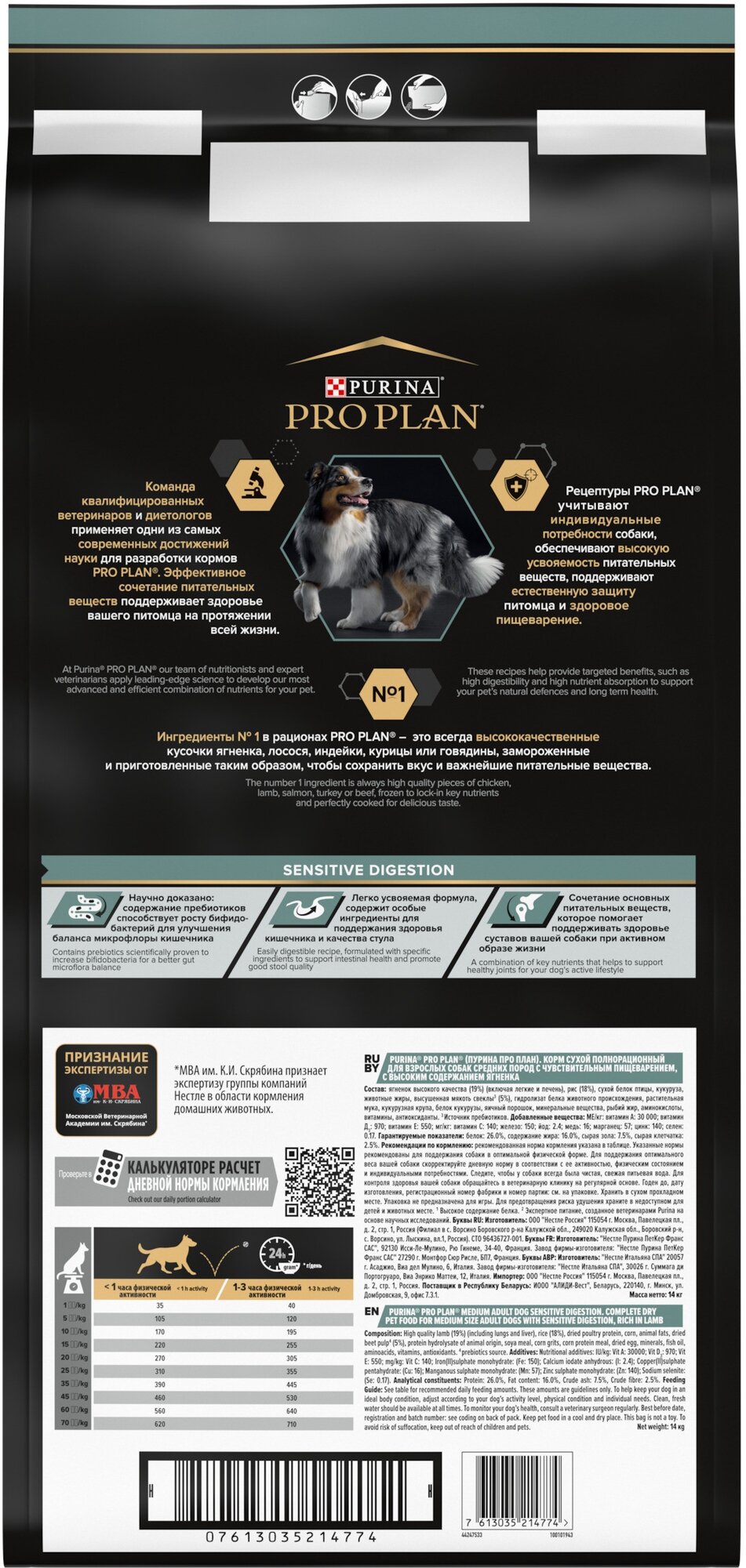 Сухой корм PRO PLAN® для взрослых собак средних пород с чувствительным пищеварением, с высоким содержанием ягненка 14 кг