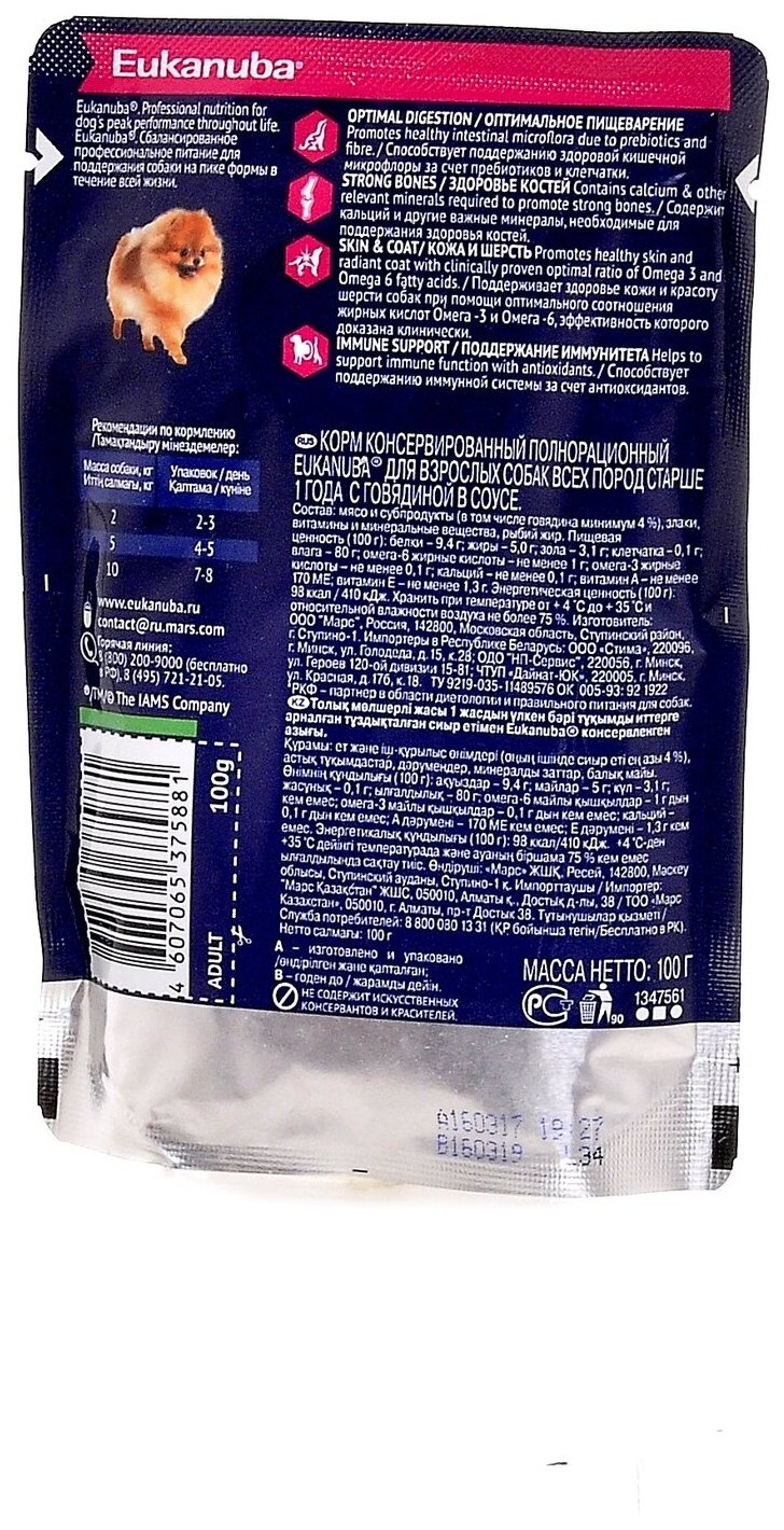 Влажный корм (Паучи) Эукануба для взрослых собак с Говядиной в соусе (цена за упаковку) 100г x 24шт