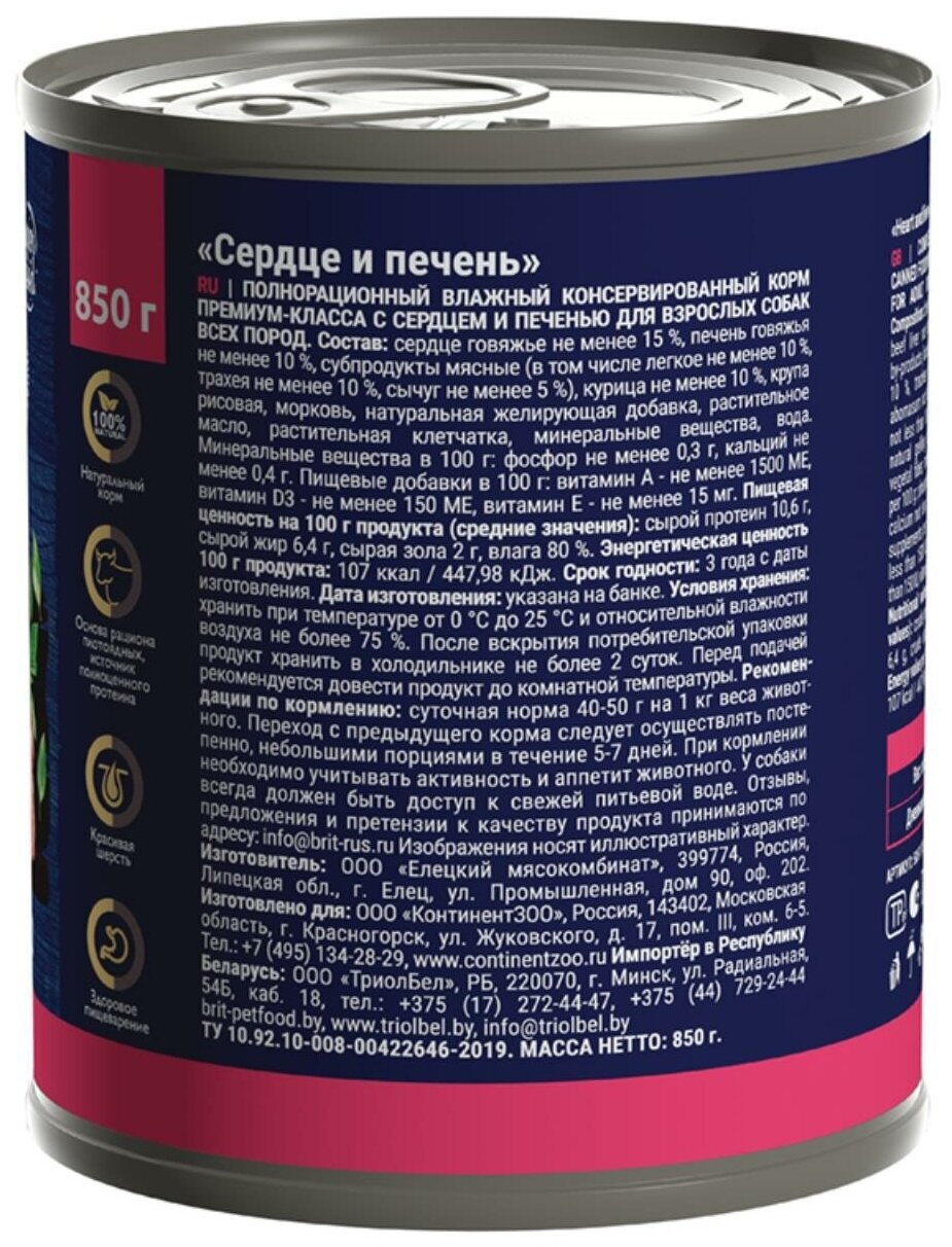 Корм Brit Premium by Nature (консерв.) для собак, сердце и печень, 850 г x 6 шт