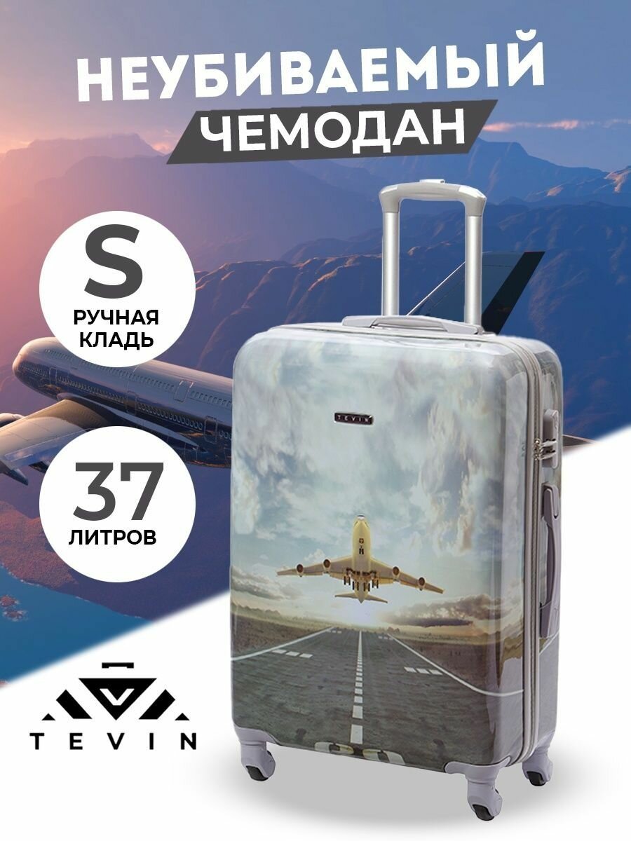 Чемодан на колесах дорожный ручная кладь в самолет s TEVIN размер С маленький 55 см ручной 37 л легкий 2.5 кг прочный поликарбонат с рисунком