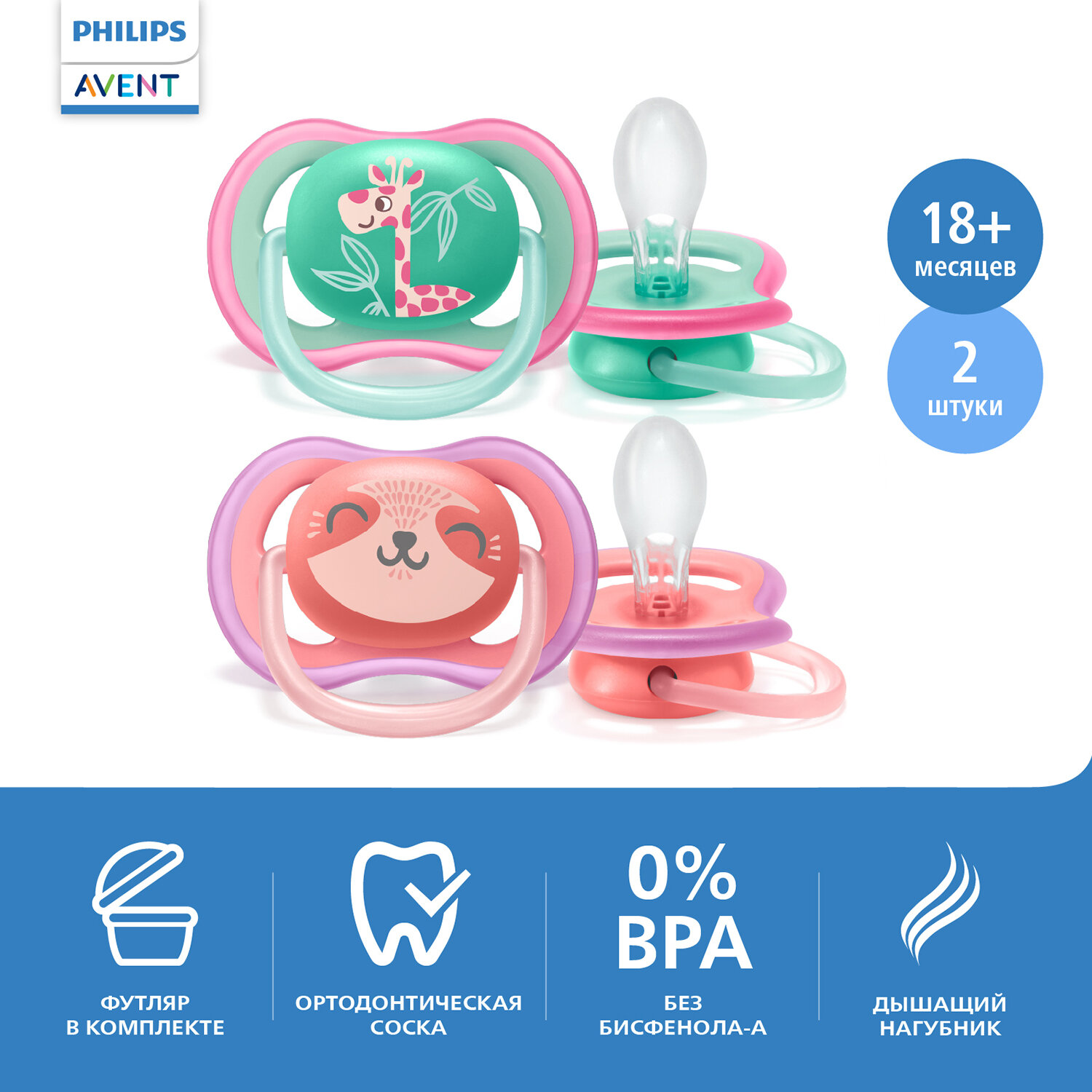 Детский товар Philips Пустышка 18+, Ultta Air, 2 шт, обезьянка и ленивец