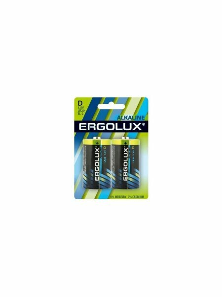 Лучшие цены. Щелочные батарейки для бытовых повседневных устройств со средним и высоким энергопотреблением. Экономичный выбор для большинства устройств. Батарейка Ergolux Alkaline BL-2 (D - LR20), напряжение 1,5В, емкость 21000мА*ч, кол-во в упаковке 2 шт, размер упаковки 84x114x34 мм, использовать при температуре от -10 до + 40 °C. Срок хранения 5 лет. Магазины в вашем городе.