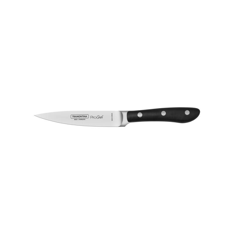 Лучшие цены. Нож кухонный Tramontina Prochef 10 см 24160/004-TR\n\nХарактеристики:\n• матрериал лезвия: нержавеющая сталь\n• материал рукояти: Поликарбонат с добавлением стекловолокна\n• назначение: универсальный\n• длина лезвия - 107 мм \n• ширина лезвия - 20 мм \n• толщина у обуха - 1,8 мм (к кончику ножа толщина уменьшается до 1/3 мм) \n• длина рукояти - 100 мм \n• вес ножа - 73 грамма\n\nКлассический овощной нож из лимитированной серии ProChef, \nкоторая входит в линейку дизайнерской посуды Design Collection\n. Магазины в вашем городе.