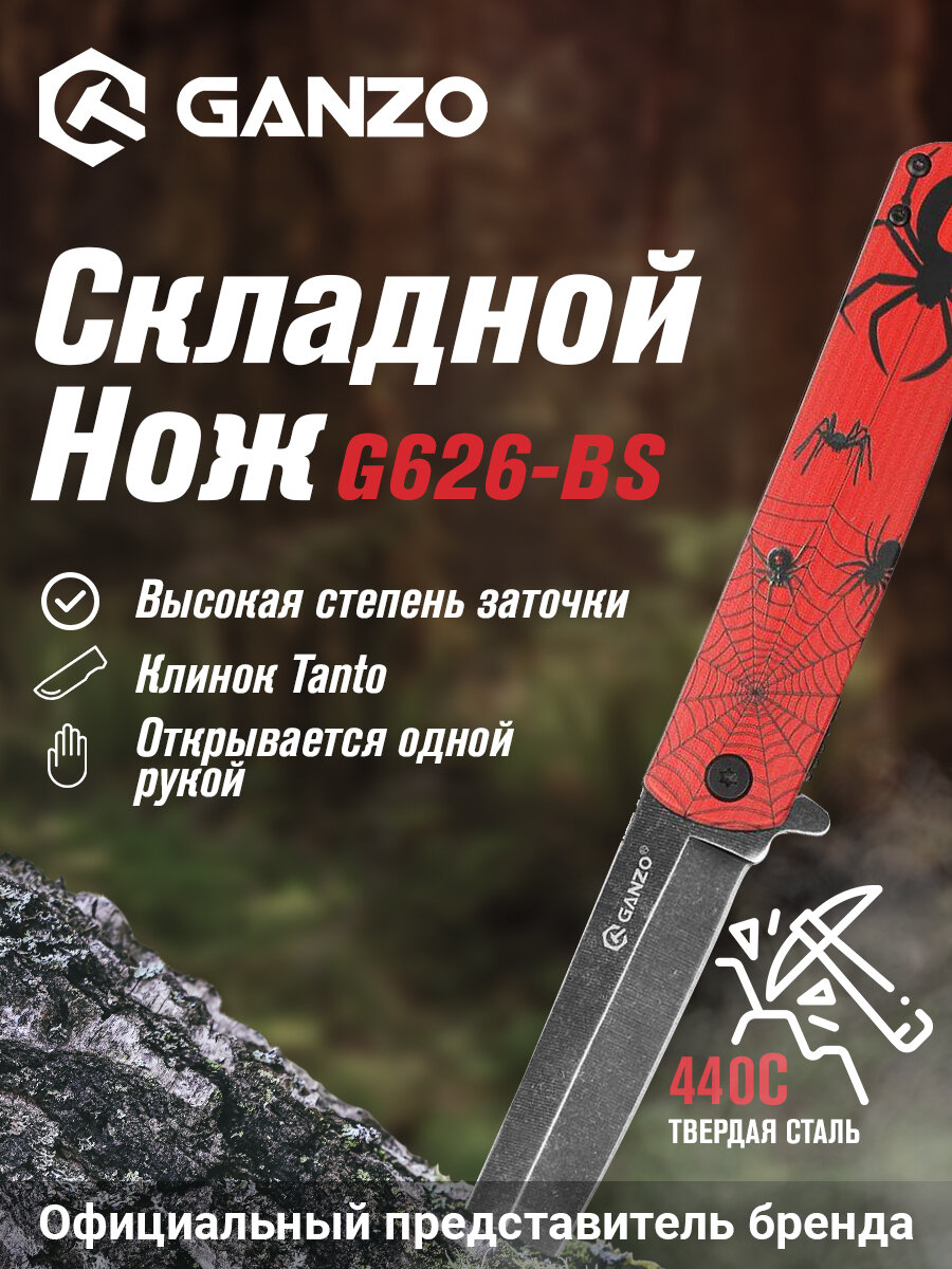 Лучшие цены. Нож Ganzo G626-RD красный Описание Ganzo G626: Нож Ganzo 626 приятно удивит не только любителей простых и практичных EDC-ников, но также и тех, кто любят некую «изюминку» в модели. Здесь таковой является дизайнерское оформление флиппера, для которого придумали 4 различных варианта рукояти. Можно подобрать обычный чёрный цвет, а можно взять что-то из предложенных экземпляров с рисунками. Это стильно выглядит, и поможет владельцу такой модели выделиться на фоне других ножеманов. У ножа клинок формы Tanto. Магазины в вашем городе.
