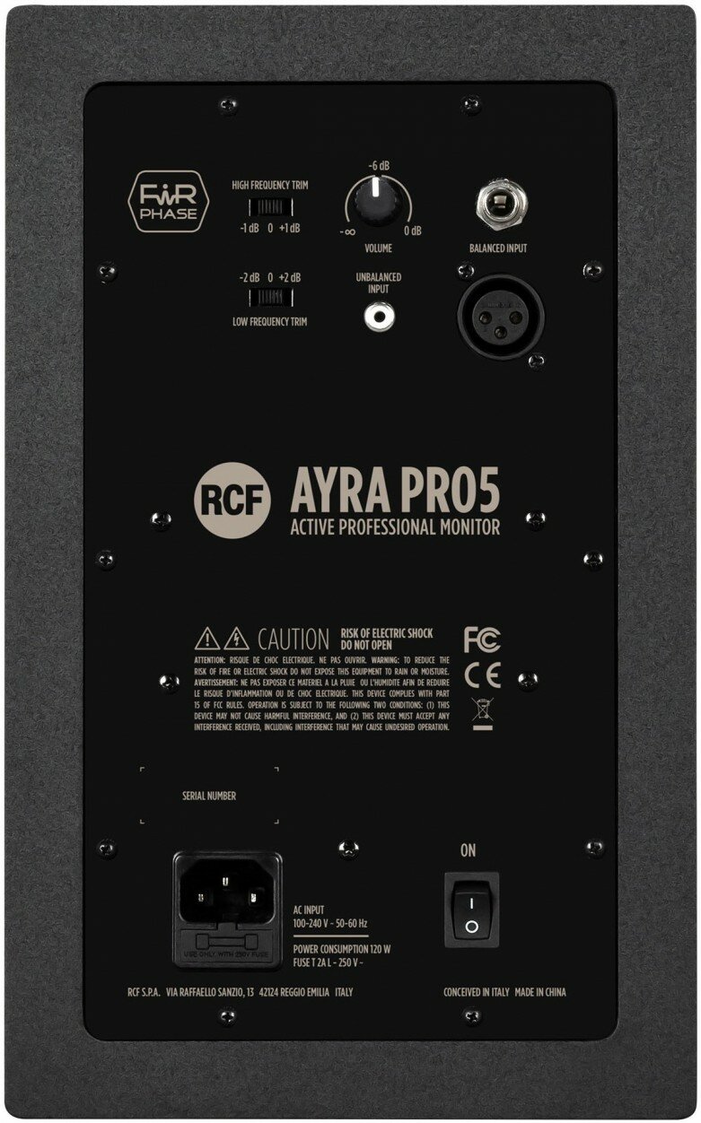 RCF Ayra PRO 5 (13000597) Активный студийный двухполосный монитор 5"+1",, 50 - 20 kHz, 100 Вт., входы: Xlr, Jack, RCA, vol. , - 6 dB, 0 dB., max SPL 107 dB, DS